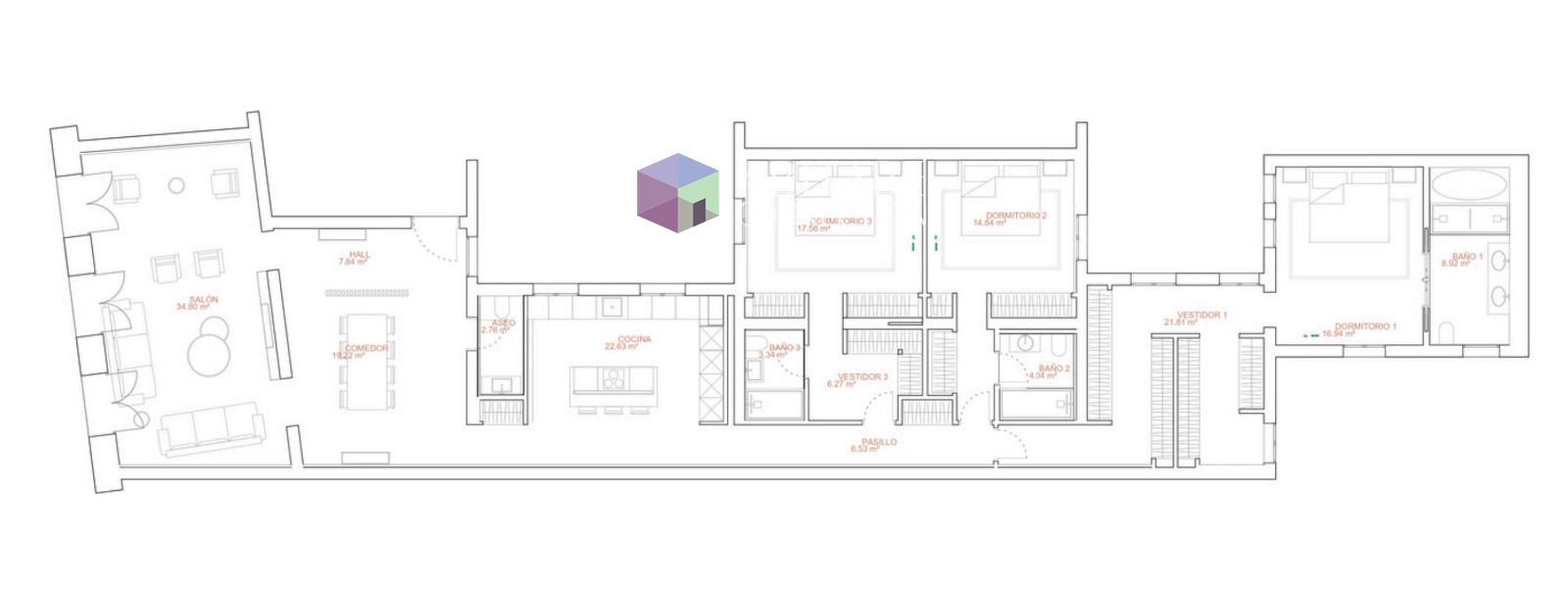 La distribución ha sido diseñada para ofrecer amplitud y confort: dispone de 3 dormitorios principales, todos con vestidor y baño en suite, además de un aseo de cortesía. El espacio social incluye un gran salón-comedor con acceso a la terraza, que aporta luminosidad y valor añadido al inmueble.
