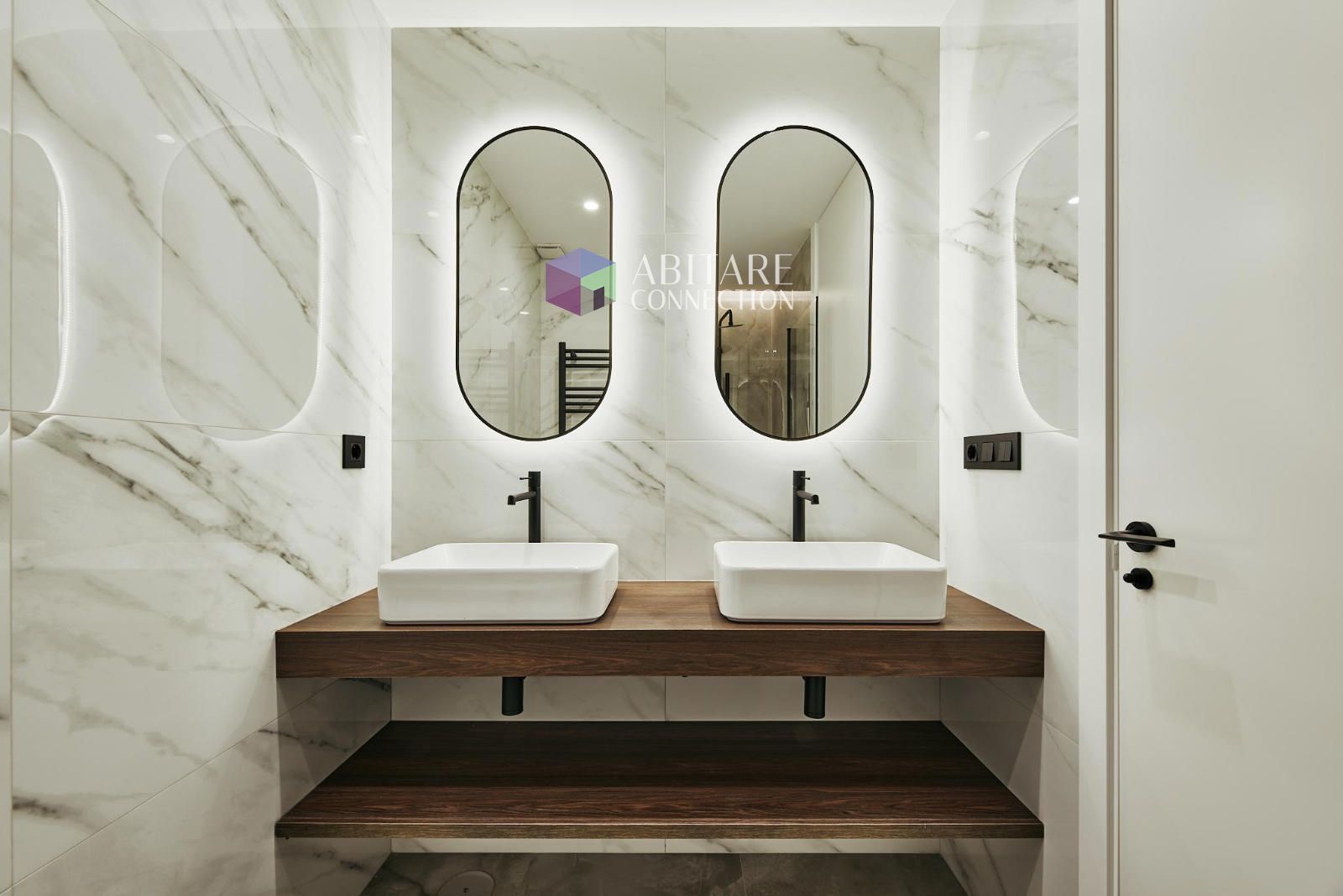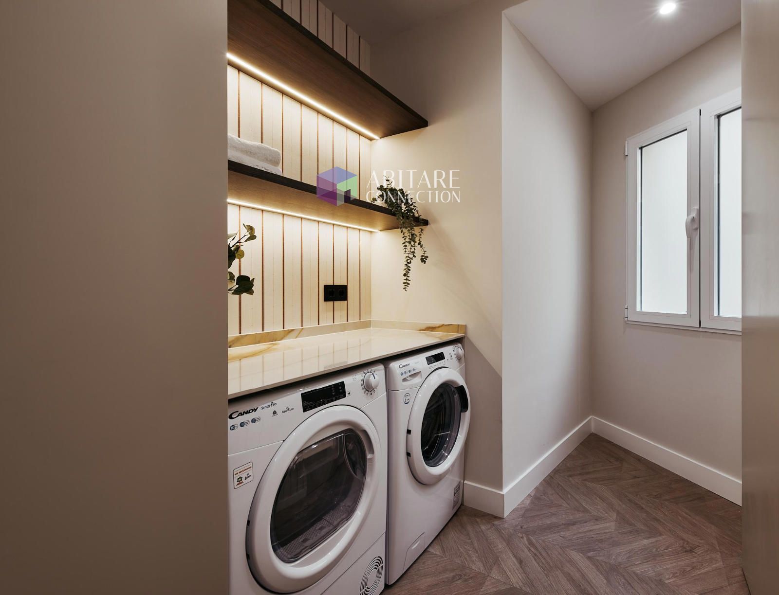 La vivienda dispone de tres dormitorios y tres baños completos, uno de ellos en suite con bañera empotrada para una experiencia de relajación superior. La cocina está totalmente equipada con electrodomésticos de alta gama y se complementa con un cuarto de lavado independiente, aportando funcionalidad y orden al hogar.