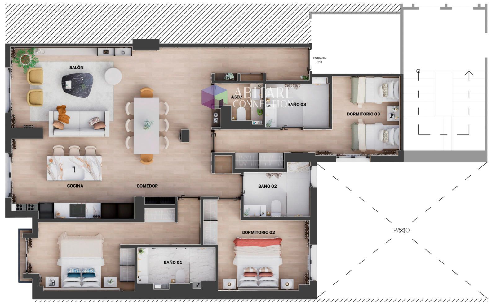 La vivienda cuenta con tres dormitorios y tres baños completos con acabados de alta calidad, todos diseñados con un estilo contemporáneo que combina elegancia y funcionalidad. Se entrega amueblada, con calefacción individual de gas, aire acondicionado por split y acceso adaptado, ofreciendo un producto listo para entrar a vivir.