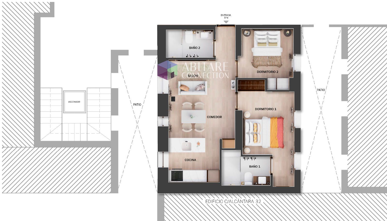 Situada en la quinta planta interior de una finca clásica de 1939 con ascensor, la propiedad disfruta de la calma del interior de manzana, combinada con la vitalidad y los servicios del entorno. El diseño de ArcTempus prioriza la armonía espacial y la luz natural, con una disposición fluida que conecta salón-comedor, cocina equipada, dos dormitorios y dos baños completos.